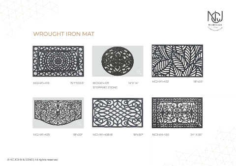 WROUGHT IRON MAT NCJ-WI-419 15.7"X23.6" NCJ-WI-421 14"X 14" NCJ-WI-432 18"x30" STEPPING STONE NCJ-WI-425 18"x30" NCJ-WI-438-B 18"x30" NCJ-WI-430 24” X 36” © NC JOHN & SONS | All rights reserved