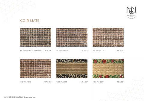 COIR MATS NCJ-PL-4007 (Coir& sisal) 18” x 30” NCJ-PL-4007 18” x 30” NCJ-PL-4009 18” x 30” NCJ-PL-4010 18” x 30” NCJ-PL-5325 18” x 30” NCJ-PL-5337 18” x 30” © NC JOHN & SONS | All rights reserved