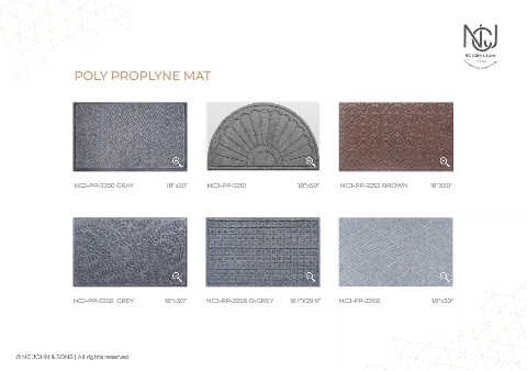 POLY PROPLYNE MAT NCJ-PP-2250 GRAY 18”x30” NCJ-PP-2251 18”x30” NCJ-PP-2252 BROWN 18”X30” NCJ-PP-2256 GREY 18”x30” NCJ-PP-2258 D-GREY 18.1”X29.9” NCJ-PP-2266 18”x30” © NC JOHN & SONS | All rights reserved